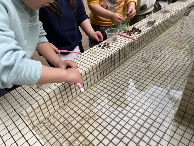 9日金曜日の放課後も、年少組、年中組、年長組さん、みんなが混じり合って「自分でやってみたい!」と、化石磨きは続いていましたよ😊