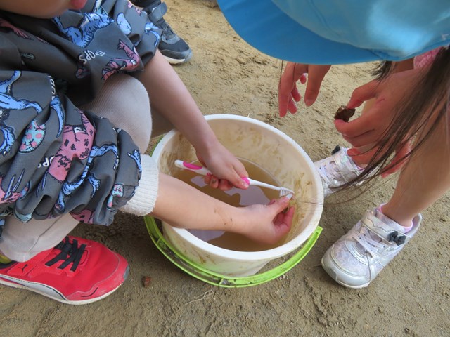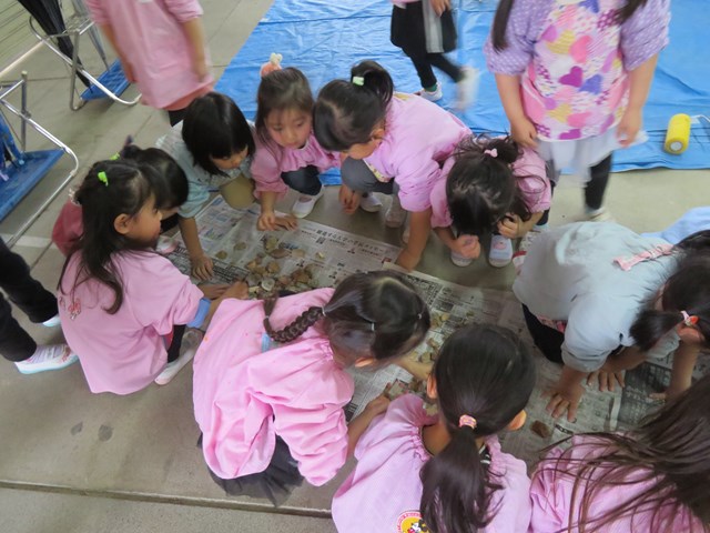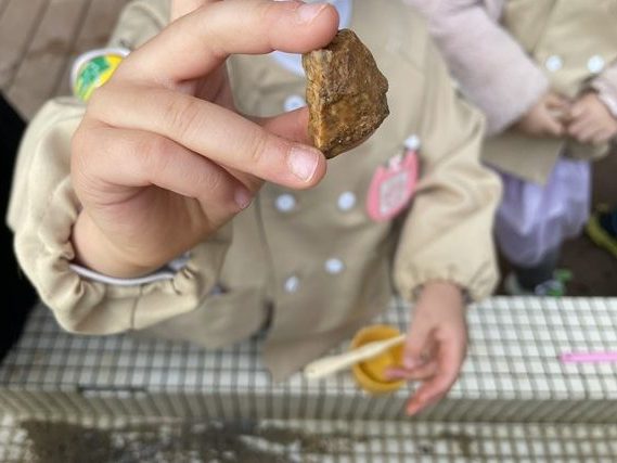 「何してるの?」「私もやりたい。」年少組さんから年長組さんまで混じり合って、化石仲間の輪が広がりました。