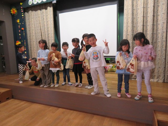 「ビンゴ!にならなかったみんなにも、参加賞があるんだよ」・・・かわいいお菓子をもらって、子ども達はにっこり😊