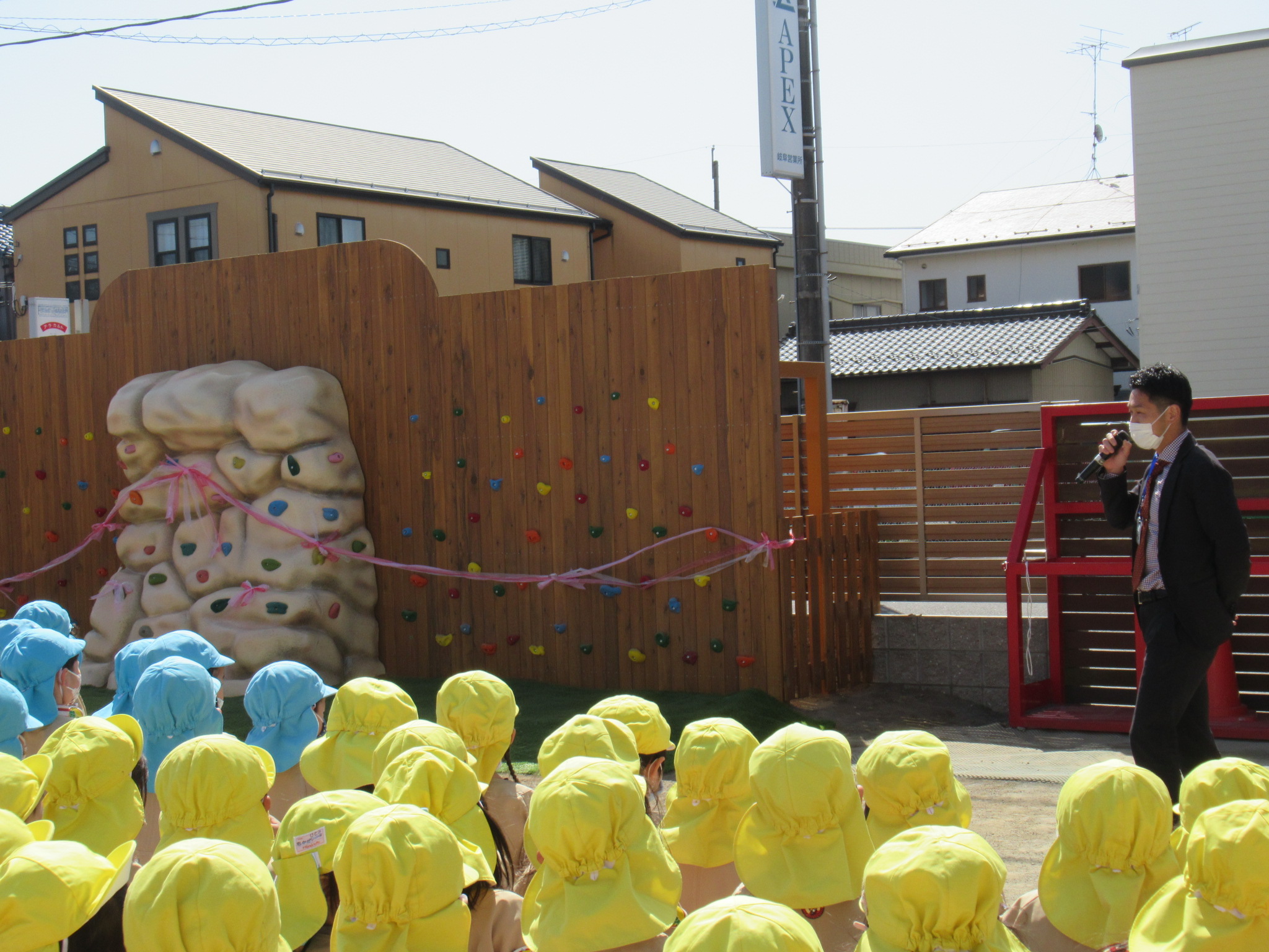 16日に年長組の子ども達が一足お先に遊び、この遊具の名前をみんなで考えてくれました。そして、17日に幼稚園のみんなで『竣工式』を行いました。