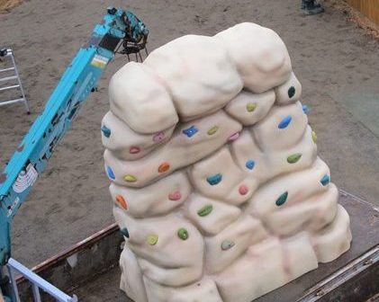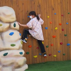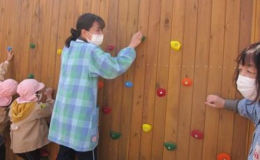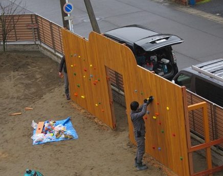 『わくわく園庭プロジェクト』の第1弾である『ボルダリング』の設置工事を、子ども達はドキドキしながら見守っていました。