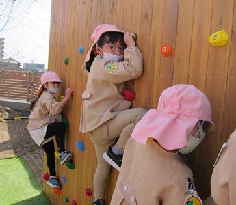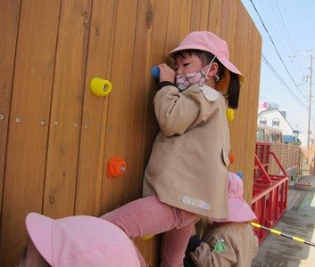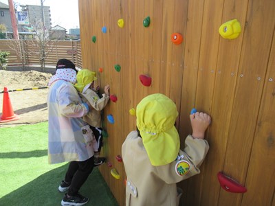 園長先生から、「このボルダリングの名前は『カラフルランド』に決まったよ!みんなでたくさん遊ぼうね!」と発表がありました。カラフルな持ち手がたくさん付いていて、ぴったりな楽しい名前ですね♪