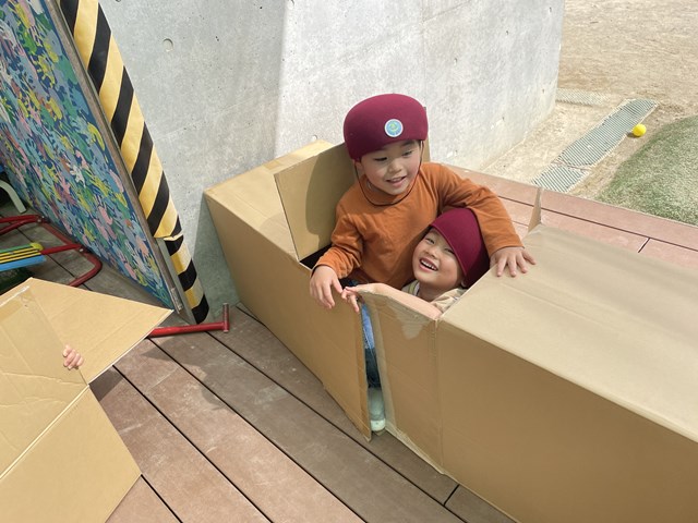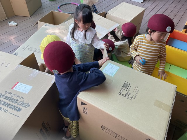 テラスは今日も大賑わい。段ボールは子ども達のお家やお風呂に変身!みんなで力をあわせて、頭をいっぱい使って、迷路のようなお家をつくっていましたよ。