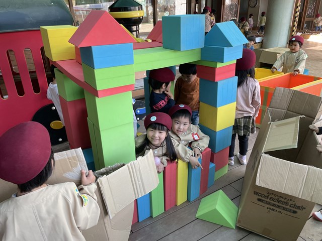 「壊れないように、ここはこうしたらどう?」「屋根は三角3つにしよ!」と年少~年長までの子どもたちが協力し合い、ワイワイと作っていましたよ。