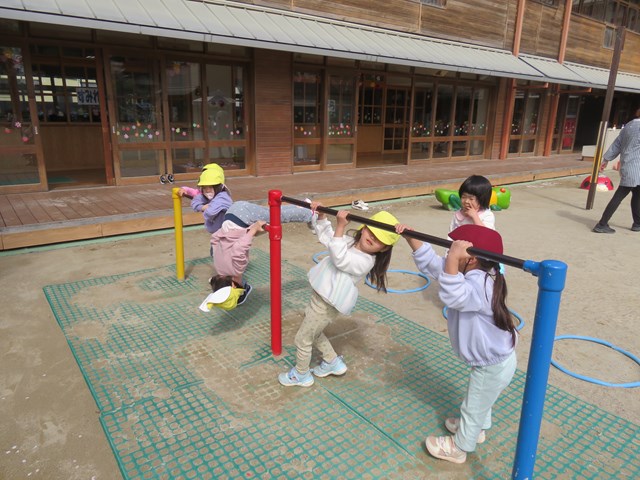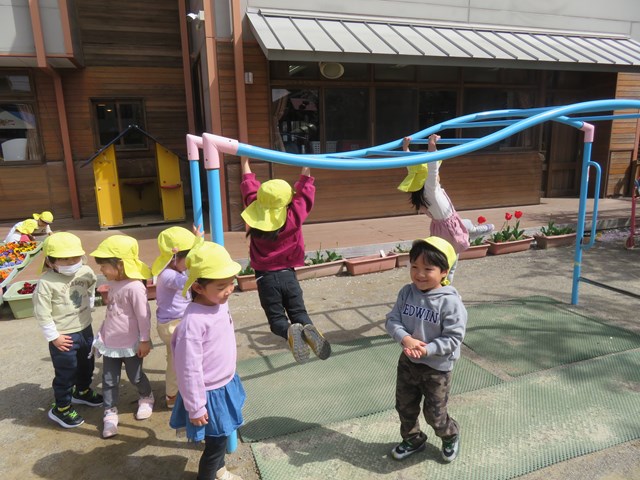 鉄棒や、雲梯に夢中の年中組さん。昨年よりもずっと、チャレンジ精神が育っているのを感じます。
