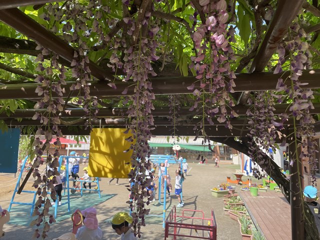 レンゲの花を摘んできて、砂場に持って遊びに行ったら、上から美しく垂れている藤の花を発見して、