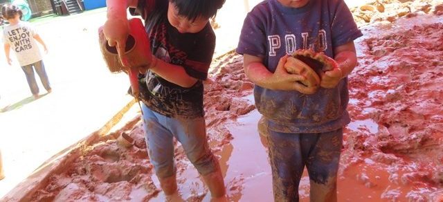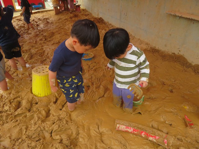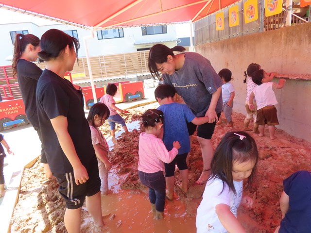 初めは泥んこが苦手だった子も、お部屋に戻ると「楽しかった~!!」「今度はもっともっと泥で遊びたい!!」と嬉しい笑顔をいっぱいみせてくれました。
