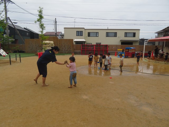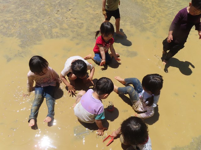 楽しくなってきた子ども達は、お友達や先生と手を合わせて、泥をつけ合ったり、自分の手足にどろんこをいっぱいつけて遊んでいましたよ。