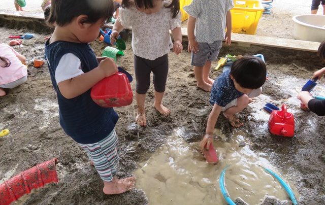 満三歳児いちご組さんも、先生たちに見守られながら今回は砂場で泥んこ遊び😊