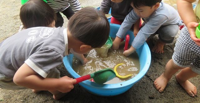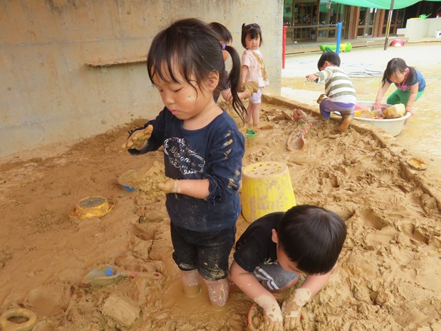 さて、5月14日、15日には、年少組のみんなと、満三歳児いちご組さんが、どろんこ遊びをはじめて楽しみました!