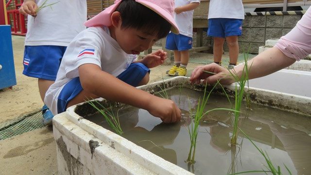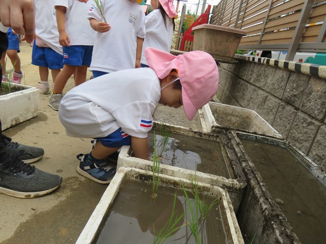 13日に、年少組さんが園庭のミニ田んぼに、稲の苗を植えました。