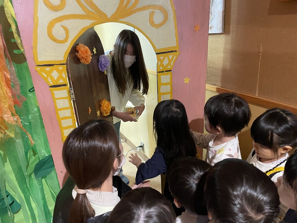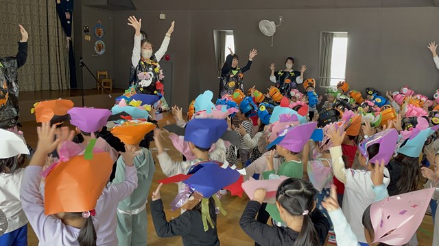 「こんな素敵な帽子や衣装だから、おうちの方に見てもらおう!!」ということで、お帰りの際には、被ったり着たりしてご家族とご対面。
