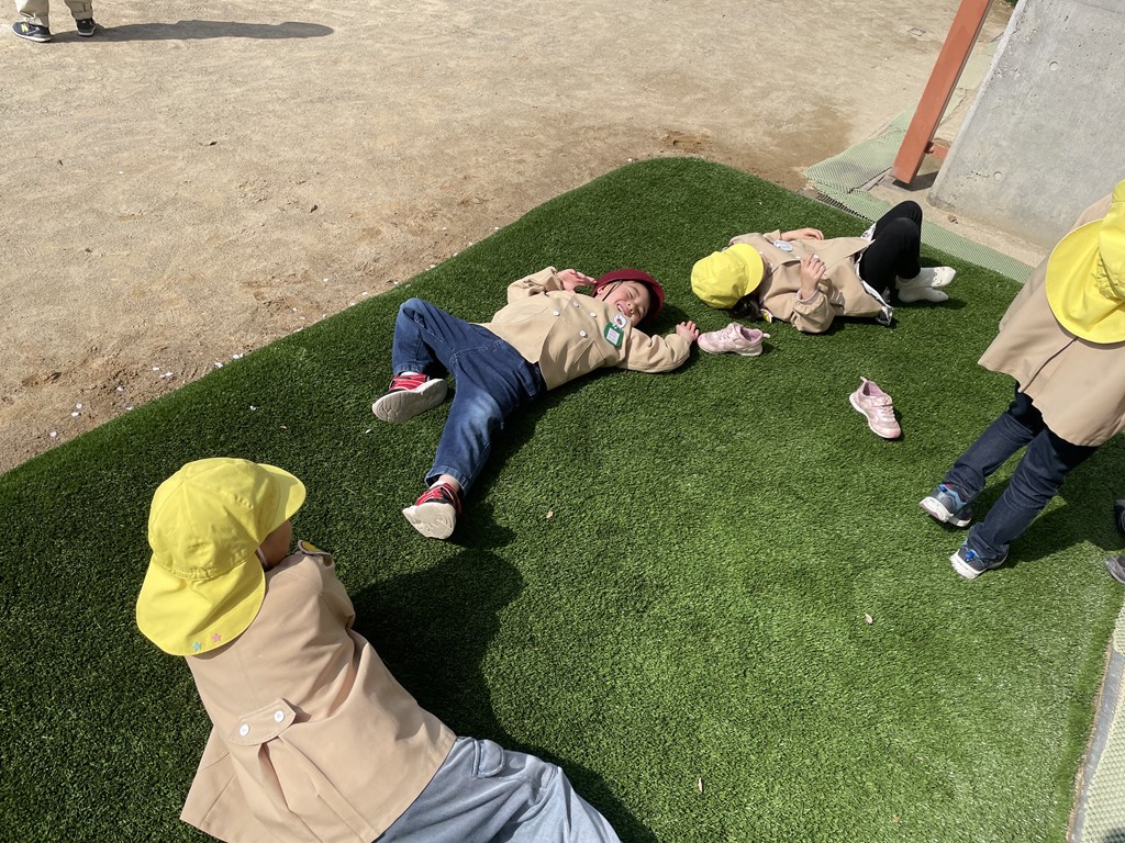 赤いコーンが奥にならんでいますね。虫探しが充実する季節までに、雑草でいっぱいにしたくて、クローバーなどの種を植えました。子ども達にお話ししたら、みんな芽を踏まないように気を付けて遊んでいますよ。