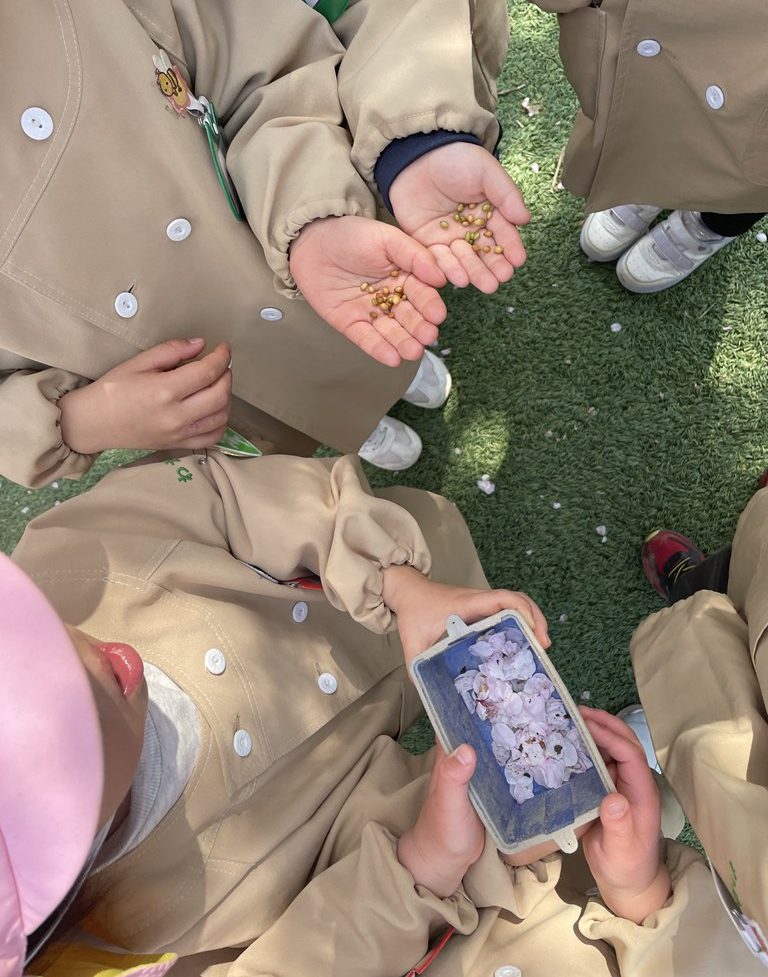 桜の木の根元で新しい種を発見したり、花びらを大切そうに集める姿をみていると、