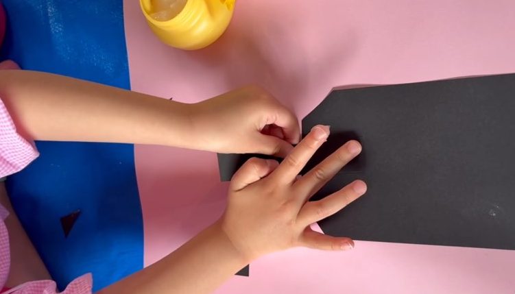 台紙に、のりを付けた指先をお散歩させてから、フライパンを真ん中に貼り付けましたよ。