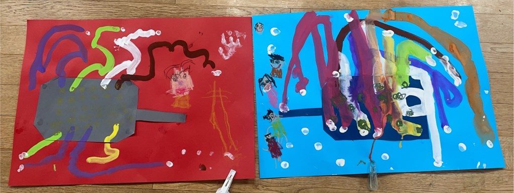 にぎやかな、ポップコーンのお祭りのような絵が出来上がりました。