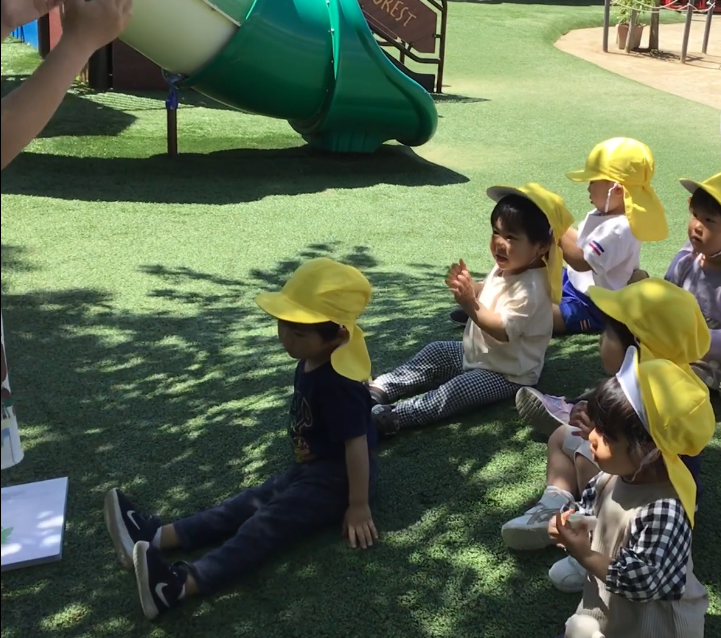 その後は、「キャベツの中から」の手遊びをしたり、大型絵本「ぴょ~ん!」をよんだり。