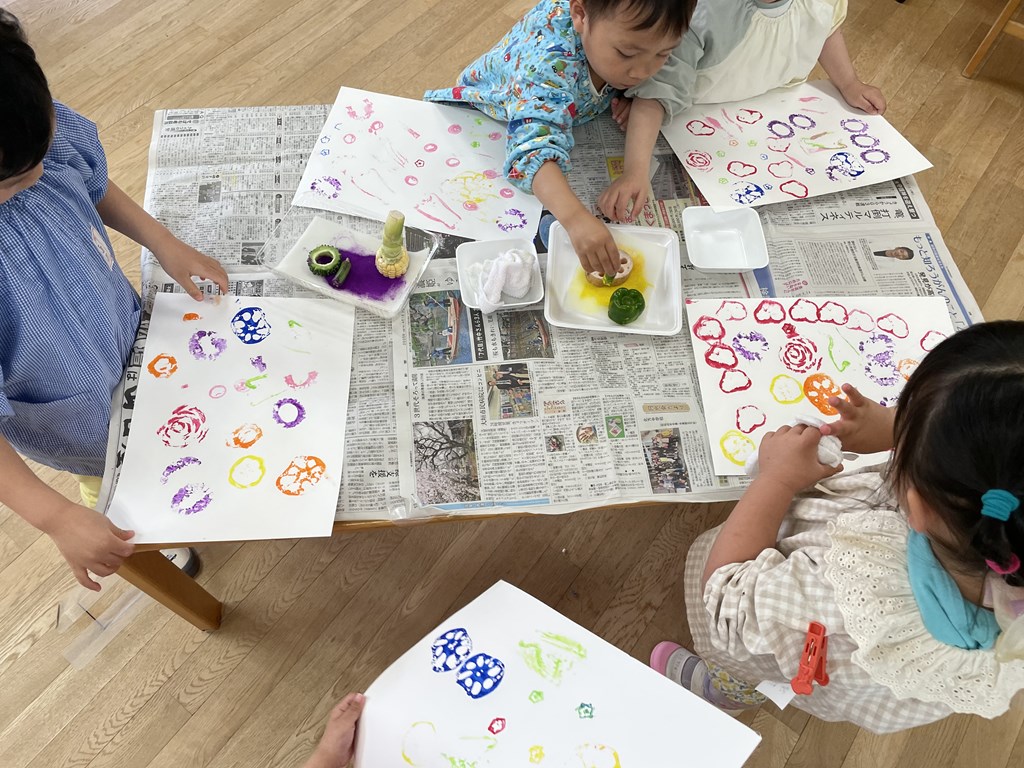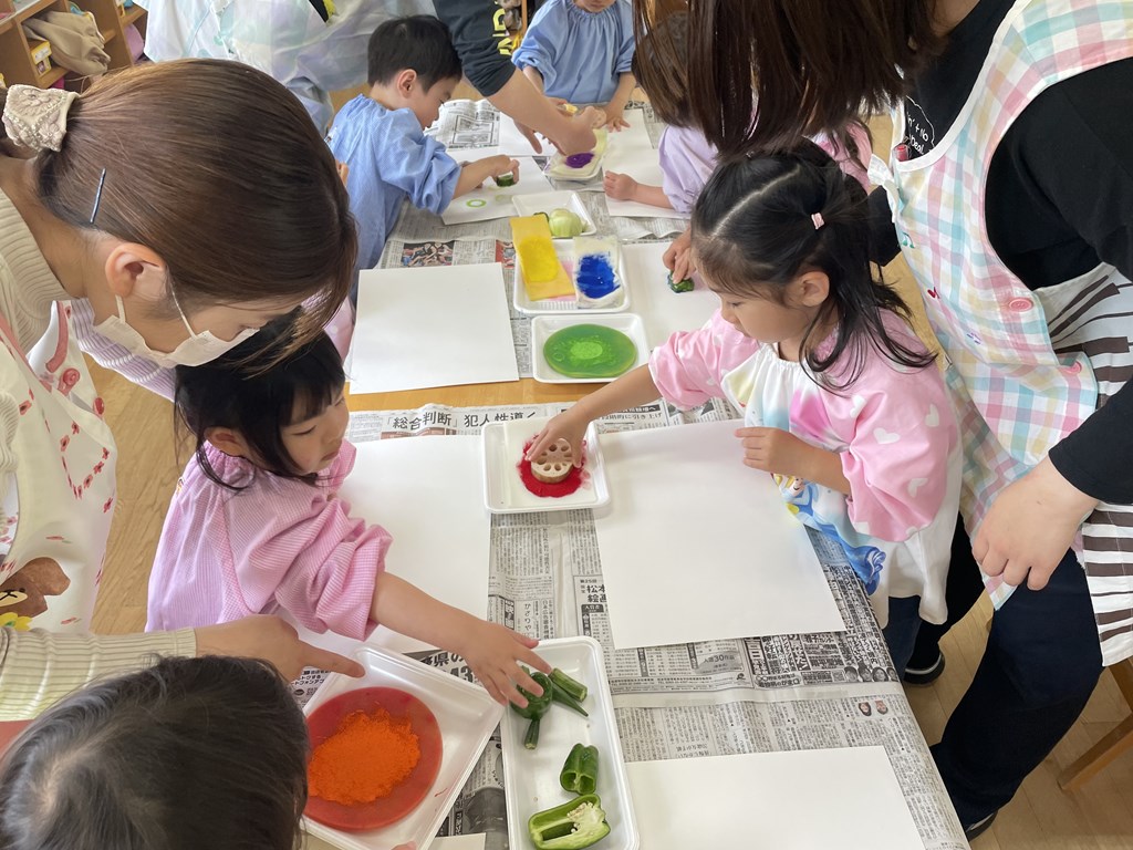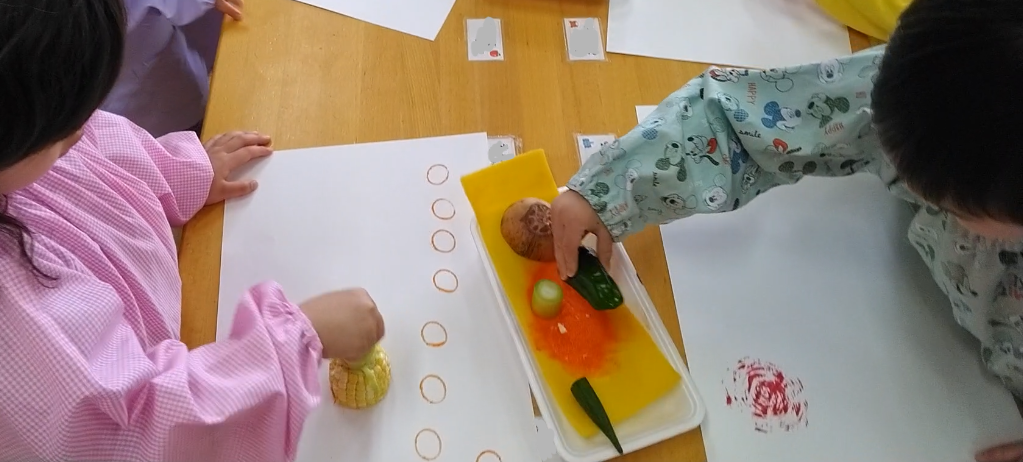 いつも給食でお野菜が出るとなかなか食べられない子たちも、「もっと押してみたい!」と、この野菜スタンプには親しみを感じながら遊んでいました。