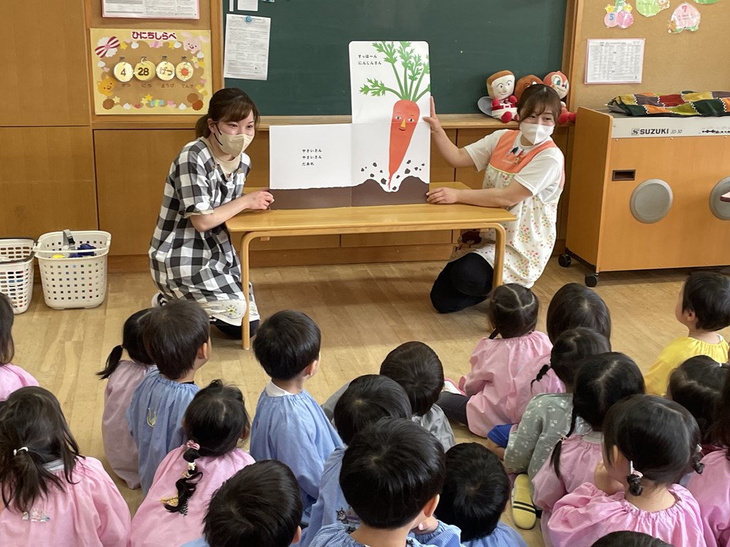 みんながワイワイにぎやかに集まったところで、先生たちが大きな絵本『やさいさん』の1ページを開きました。
