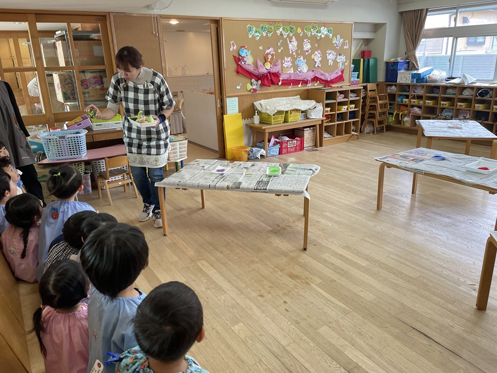 4月28日(月)、「今日は野菜スタンプやるんだよね?」とワクワクしながら登園してきた年少組さん。休み明けで元気がなかった子に「スタンプで遊ぶよ」と話すと、それを楽しみに過ごせたり・・・。