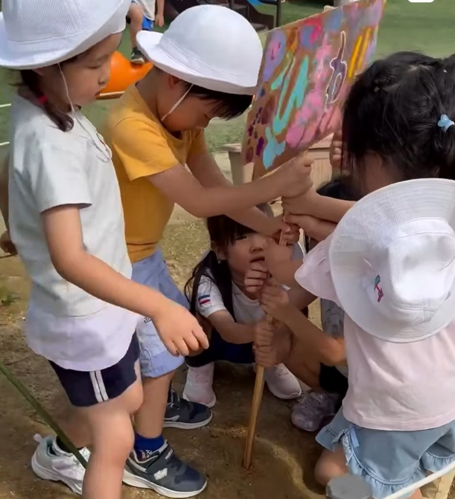「どこに立てよう?」「真ん中くらいがいいよ。」とわいわい相談し合って、園長先生にスコップで穴を開けてもらい、試行錯誤しながら立てましたよ。