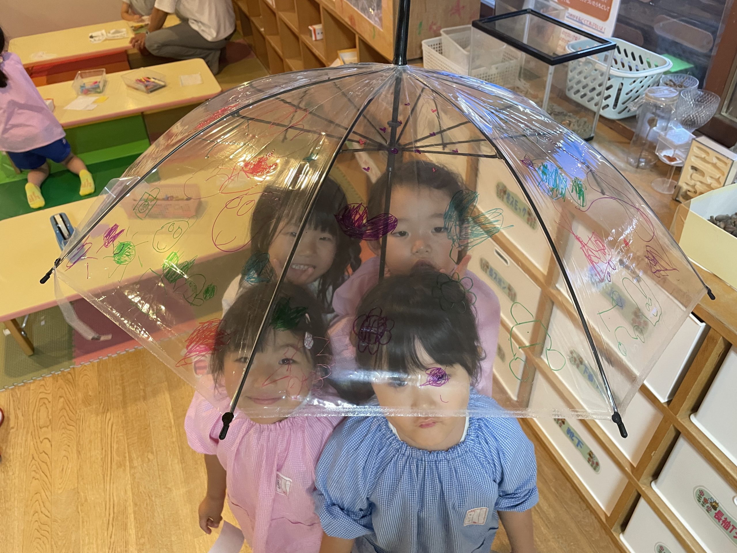わくわくコーナーでは、こんな風に、傘にすてきなお絵かきもしてみたり・・・オリジナルの傘をさしてみると、心がウキウキするね😊