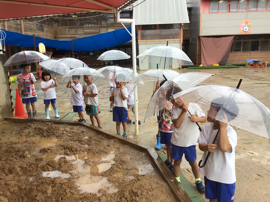 今日は短い時間のお散歩だけで終わってしまった年長組ですが、明日の「どろんこ遊び」が雨降りで出来なかったら、裸足で傘のお散歩しようね。