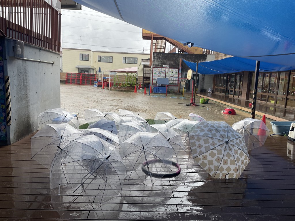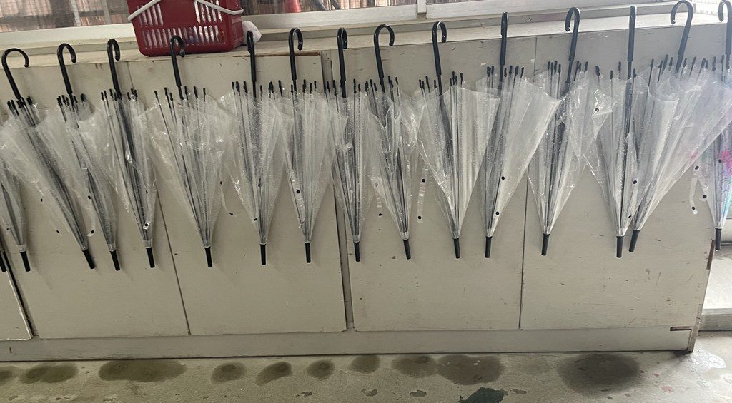 強く降っていた午前中。さっそく、年長組の子ども達が、バス車庫にずらりと並んだ傘を、とりにやって来ましたよ。