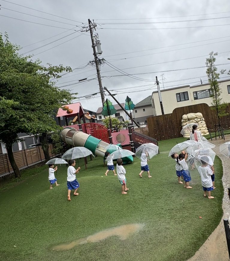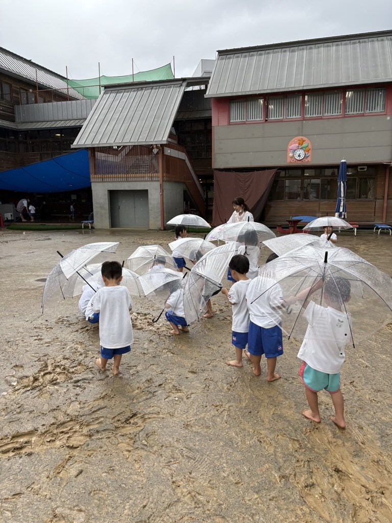 みんな、裸足で嬉しそうな笑顔いっぱい。小さいお手々にしっかりと傘を持って、少し弱まった雨の中をお出かけしました。