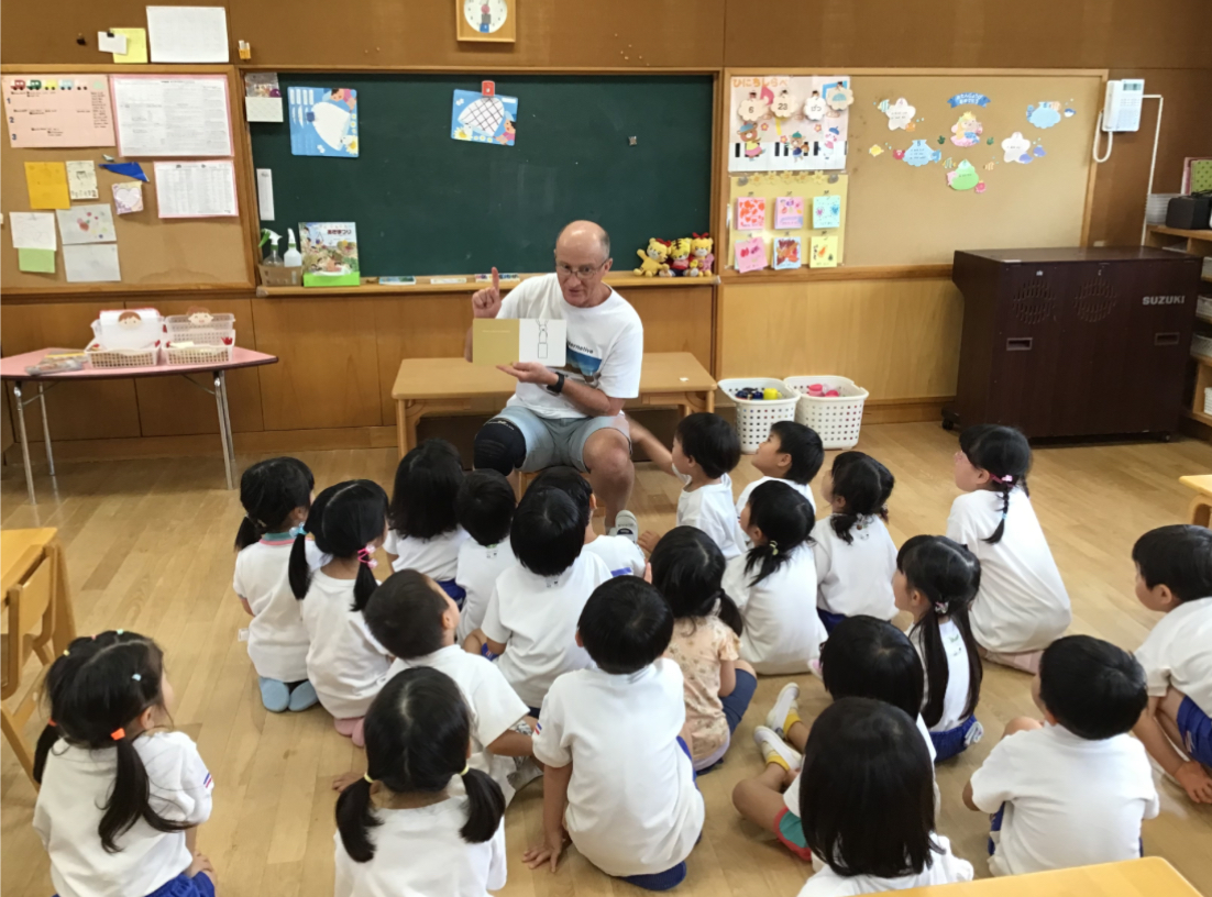 英語の絵本も読んでくれるクリス先生。そんなクリス先生の所に、勇気を出してお話に行く姿も。