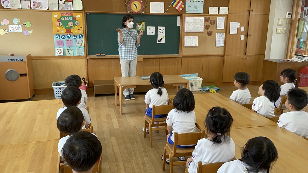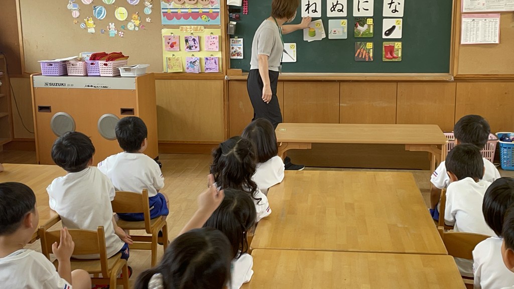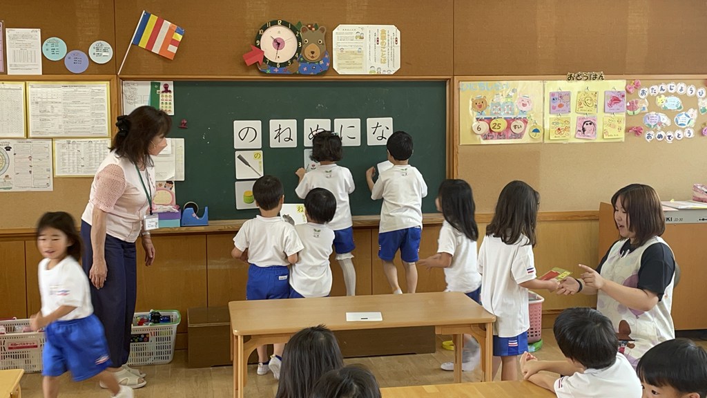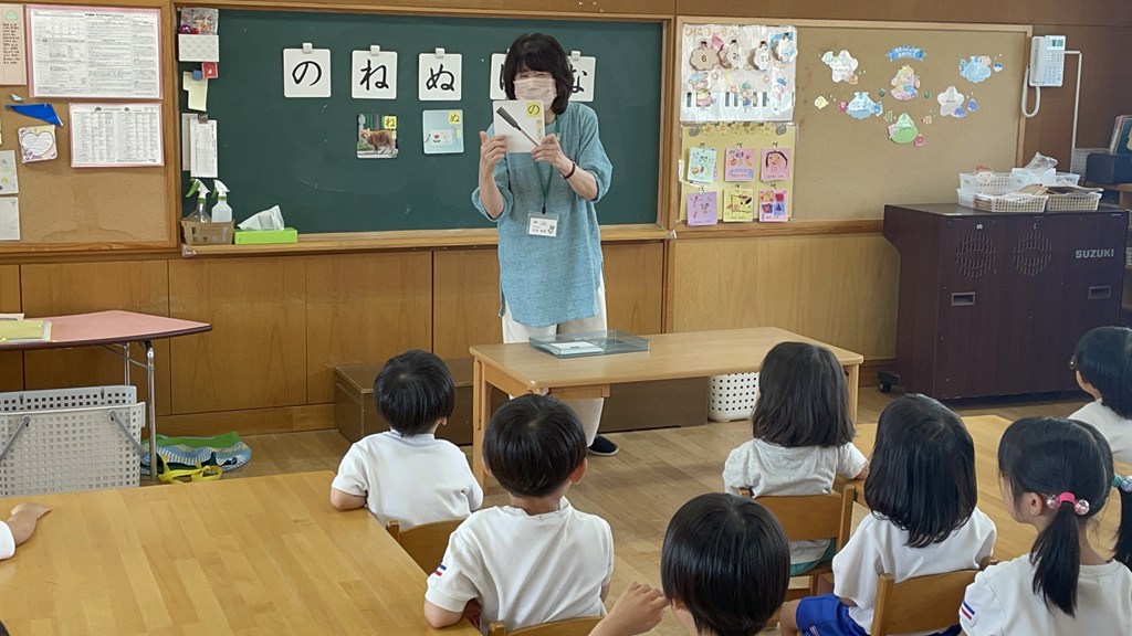 ・・・すると、字の形や発音が似ている『ね』と混同して、「ねこ!」という声が多く聞かれました。先生は「ぬりえ」の絵カードを見せ、当てっこしてから、子ども達と何度も発音します。