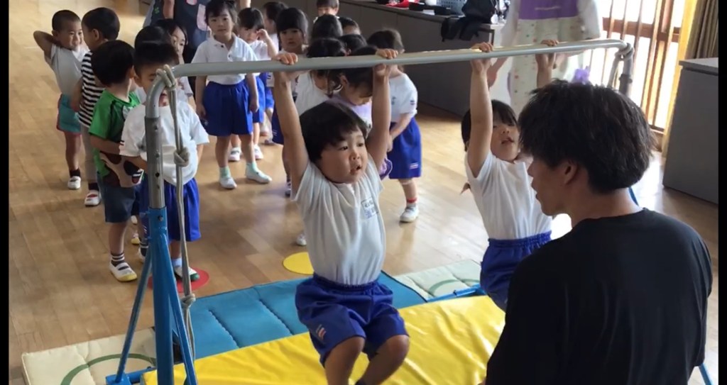 3階ホールに行くと、大きな鉄棒がみんなを待っていました。
