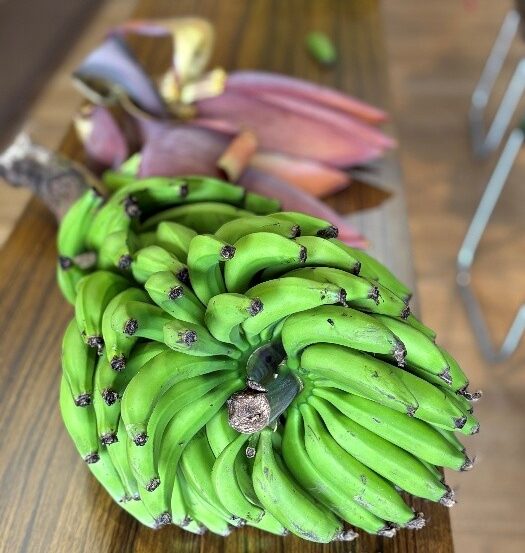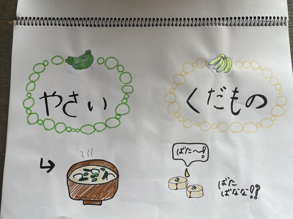 黄色いバナナは「くだもの」だけど、黄色になる前の緑色のバナナは「お野菜」で、蒸すとホクホクの甘くないバナナです。お味噌汁や、シチューとかカレーとかお料理に使えるんだよ。