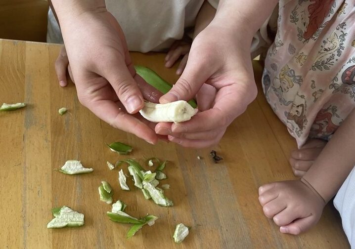 半分に折ってみると、「あ、バナナだ!」中身が現われたので、一生懸命硬い皮をむいてみましたよ!