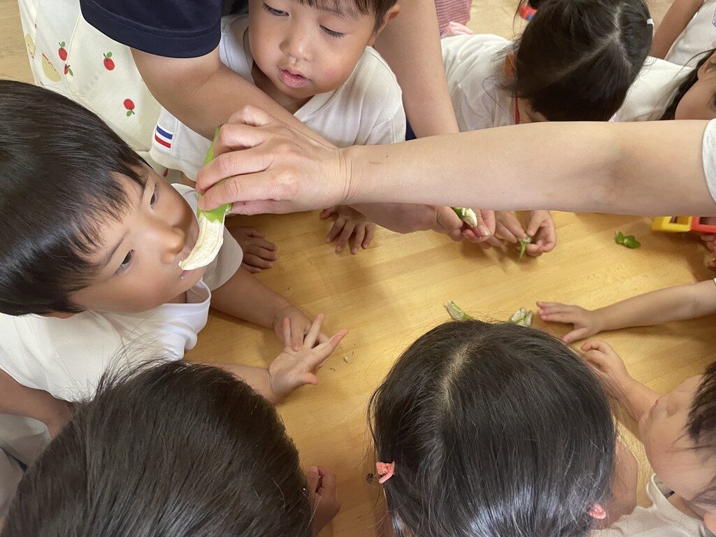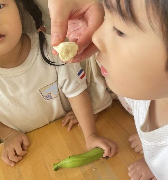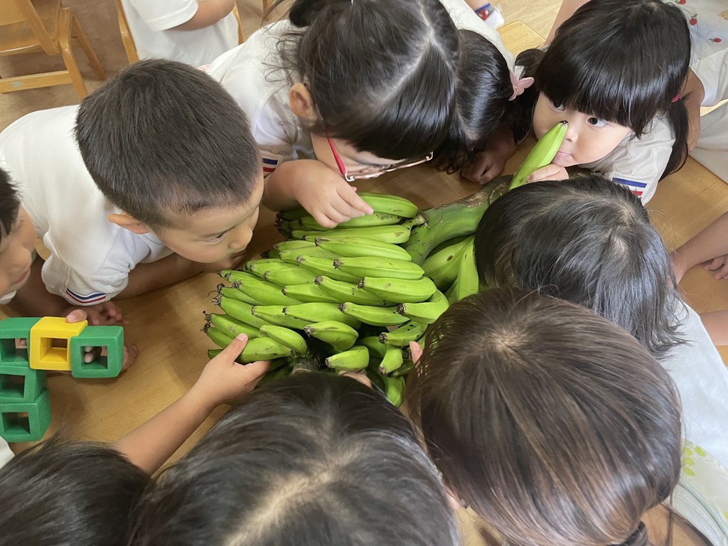 バナナが大好きな子ども達や先生は、緑のバナナの中身が見たくてたまりません。