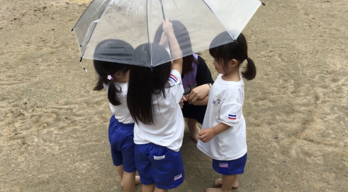 大好きなまみ先生とみんなで傘に入ってみると、なんだか小さなお家みたいだね。