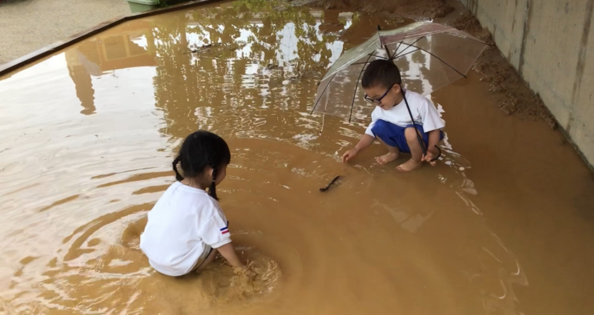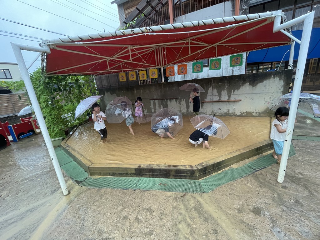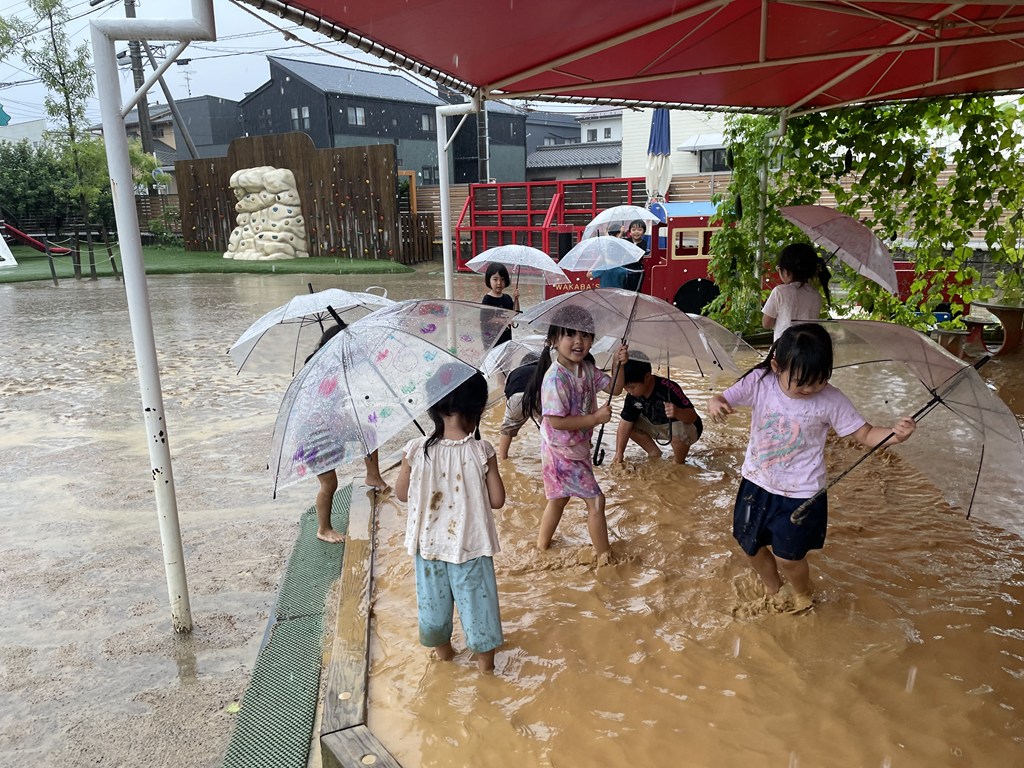 そうです。この日、どろんこ遊びを予定していた年中組の子ども達が、園庭で雨を喜びながら、思いっきり弾けていました。