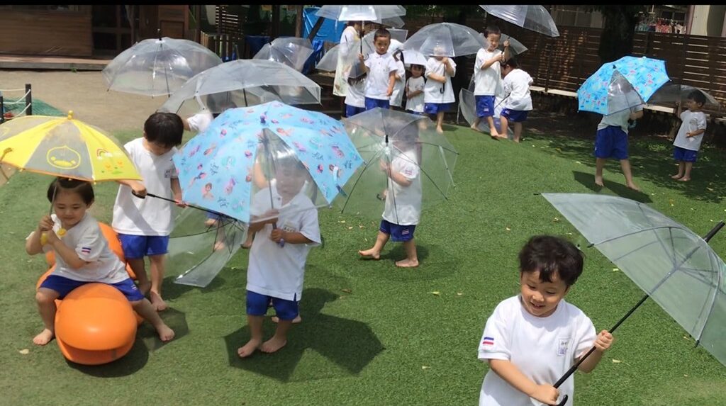 雨上がりの園庭では、たくさんの傘達がまるでダンスしているかのよう。