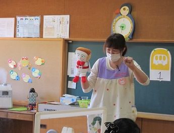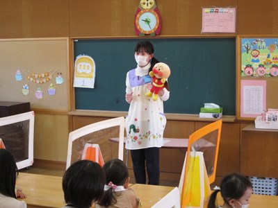 そして、先生が早速、アンパンマン達と一緒にみんなのお名前を呼びました。「は~い!」と手を上げてお返事する子も、ちょっぴり照れてお母さんに隠れてしまう子も。
