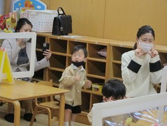 手遊びは、みんなも知ってる『とんとんとん、アンパンマン』・・・小さなおててをいっぱい使ってアンパンマンやしょくぱんマンに変身。そして、お母さん達も一緒に♪