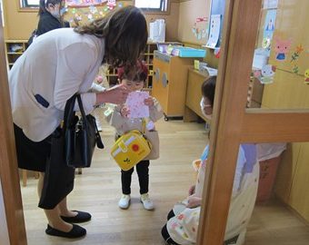 お部屋での式が終わり、入園のお祝いのプレゼントをもらって、大事そうに受け取る子ども達。かずこ先生が「また月曜日にまってるからね!」と声をかけると、小さく頷いてくれました。