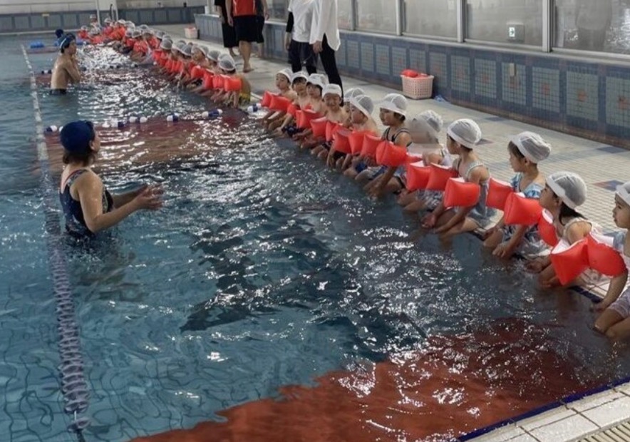 コーチが全部で4名、1グループ12人~13人です。そこに加えて、プールサイドで幼稚園の先生達が見守りをしています。