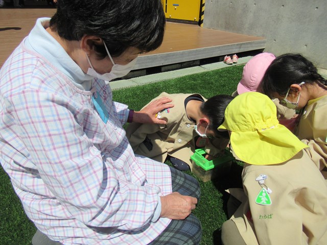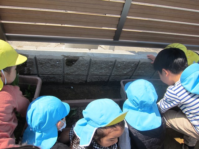 なにやら、黄色や水色のカラー帽子がひしめき合っているのを発見。よ~くお話を聞いてみると・・・「乾いたら死んじゃうから、お水をかけてあげなきゃ。」「触ったらびっくりするから、やさしくみててね。」と声をかけあって、みんなで心配そうに見つめていました。