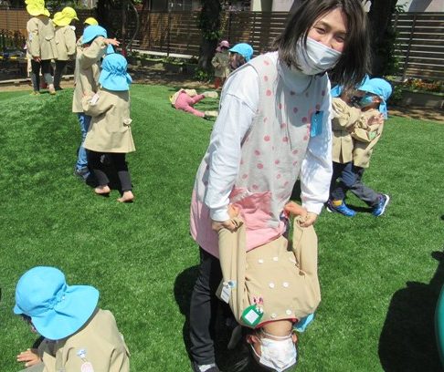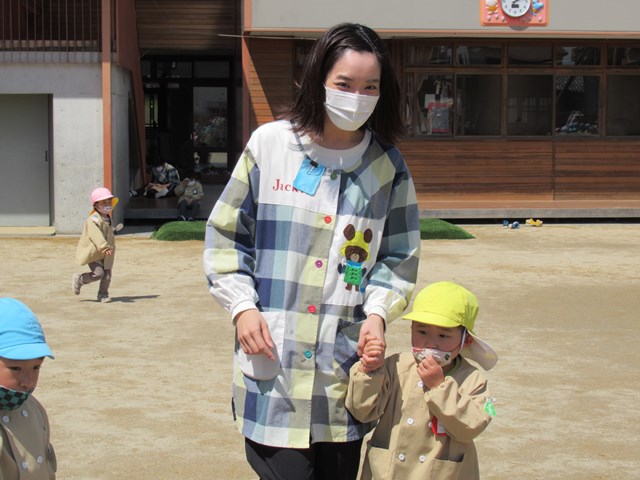 やさしい笑顔のあやこ先生と、いつも追いかけっこしているみんな。昨年すみれ組だった子ども達も「あやこせんせーい!」と寄ってきます。