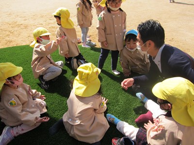 かわいい子ども達が「えんちょうせんせい、あそぼうよ!」「しゅにんせんせい、あそぼー!」・・・にぎやかに誘いに来てくれるのが嬉しくて、みんなで園庭でお話ししたり、鬼ごっこしたり。「泣いてる子はいないかな?困ってるのに言えずにいる子はいないかな?」と見守り隊のパトロールも兼ねて、わいわい遊んでいますよ!