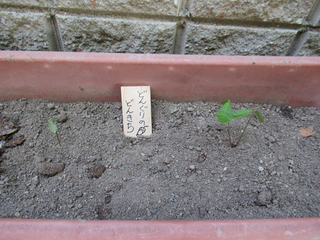 『どんぐりのどんきち』・・・なんと、誰かが落としていったドングリから芽が出て、園庭の片隅で根付いているのを、年長組のりょうた君が発見!!