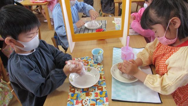とっても真剣な表情で、「三角おにぎりはむずかしいね。」「ま~るいおにぎりなら作れるよ!」と、すっかりお母さん気分になった子ども達。ぎゅっぎゅっと力を入れてにぎったよ。