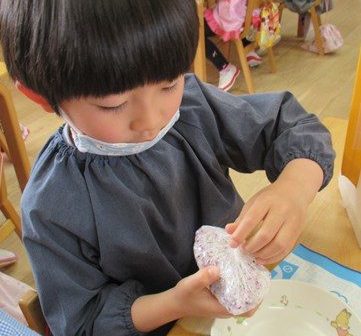「先生、できたよ!」こちらは、まん丸のおにぎりがかわいいね。「みてみて、自分で作れたよ~!」なかなか大きなおにぎりが完成♪