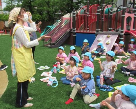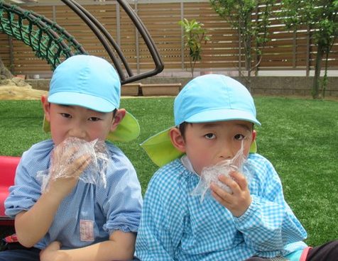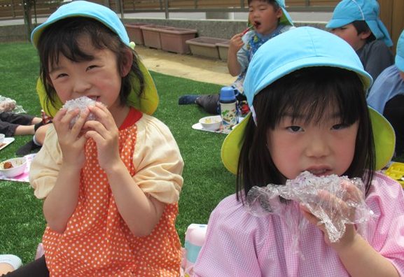 これから、お給食の献立がご飯の日にはこんな風におにぎりをにぎって、順番に芝生deランチを楽しみたいと思います。年中組や年少組さんも、全クラスの子ども達に、気持ちよいランチタイムを味わってもらいたいなと考えていますよ!