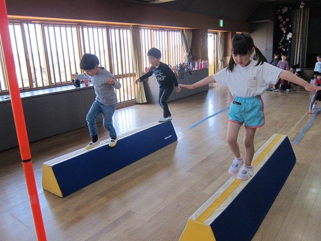 特に平均台では、落ちないように落ちないように・・・とどうしても慎重になります。最初はバランスを取りながら、「落ちないように・・・」挑戦する子ども達。